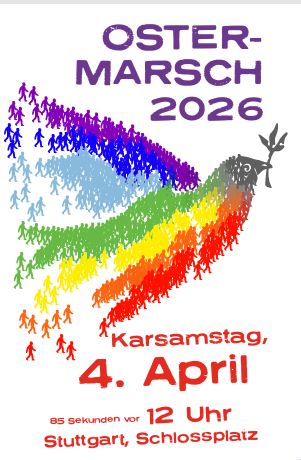 Für die gemeinsame Anreise per Bahn zum Ostermarsch nach Stuttgart am Samstag, 4. April 2026 ist Treffpunkt im Hauptbahnhof Karlsruhe um 10:15 für Fahrt mit IRE Abfahrt 10:32 Uhr, Ankunft in Stuttgart 11.25 Uhr.